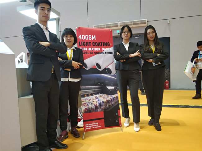 Nuestro 90gsm, 100gsm papel de sublimación de secado rápido muy popular en la Expo y muchos agentes interesados nuestro vinilo de transferencia de calor tales como PU, PVC, brillo, etcetera. Aunque muchas personas sólo tienen una mente para empezar de textil digital sublimación, pero están muy interesados en nuestros productos.